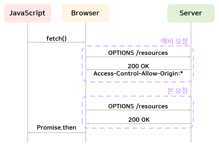 OPTIONS 메서드로 서버에 예비 요청을 먼저 보내고, 서버는 이 예비 요청에 대한 응답으로 Access-Control-Allow-Origin 헤더를 포함한 응답을 브라우저에 보냅니다. 브라우저는 단순 요청과 동일하게 Access-Control-Allow-Origin 헤더를 확인해서 CORS 동작을 수행할지 판단합니다.