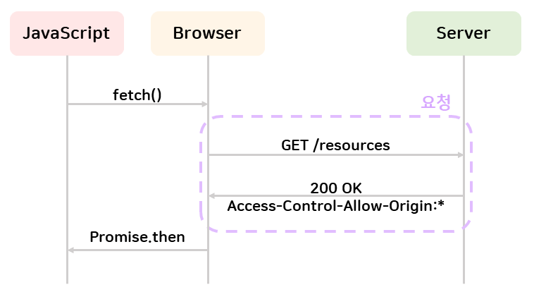 단순 요청 방법은 서버에게 바로 요청을 보내는 방법입니다. 아래 그림은 자바스크립트에서 API를 요청할 때 브라우저와 서버의 동작을 나타내는 그림입니다.